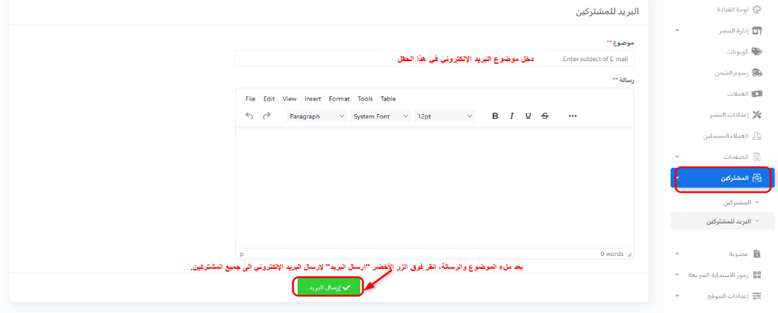 الوصول: للوصول إلى صفحة “إرسال بريد إلكتروني للمشتركين”، اتبع المسار التالي في لوحة التحكم: ” المشتركون ” -> ” إرسال بريد إلكتروني للمشتركين “.