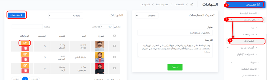 الوصول: للوصول إلى إعدادات “اراء العملاء “، اتبع المسار التالي في لوحة التحكم: “الصفحات” -> ” معلومات عنا ” -> “اراء العملاء “.