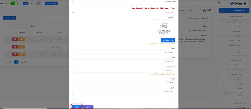 نظرة عامة: يتيح لك هذا القسم إدارة اراء العملاء التي قد تظهر على صفحة “معلوملت عنا”، والتي تسلط الضوء على آراء العملاء وتجاربهم الإيجابية.