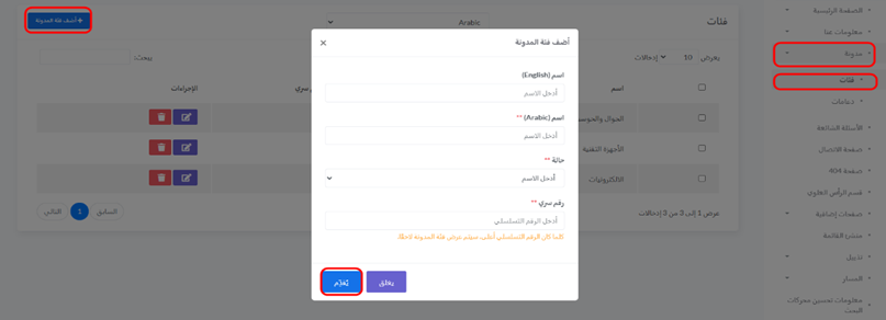 عند النقر فوق زر “+إضافة فئة مدونة”، ستظهر نافذة منبثقة لإضافة تفاصيل الفئة الجديدة: