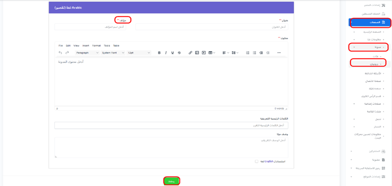اللغة العربية: تتوفر حقول مماثلة (العنوان، المؤلف، المحتوى، الكلمات المفتاحية، والوصف التعريفي) لإدخال المحتوى باللغة العربية.