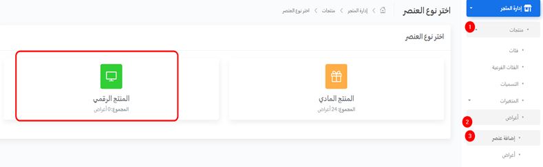 الوصول: من “إدارة المتجر” > “ العناصر” > “ + إضافة عنصر ” وتحديد “ المنتج الرقمي ” من شاشة “ اختيار نوع العنصر”.