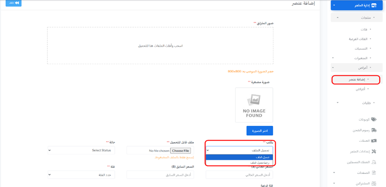 o الوصف: حدد حالة المنتج من القائمة المنسدلة (مثال: “نشط” ليكون مرئيًا للعملاء، أو “غير نشط” لإخفائه). - التصنيف :