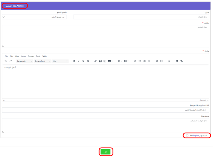 o الوصف: إذا كانت اللغات المتعددة ممكّنة، يمكنك النقر على “استنساخ للغة العربية ” لنسخ المحتوى من القسم الإنجليزي أو إدخال الترجمات يدويًا للعنوان، الملخص، الوصف، الكلمات المفتاحية الوصفية، والوصف التعريفي باللغة العربية. - إرسال :