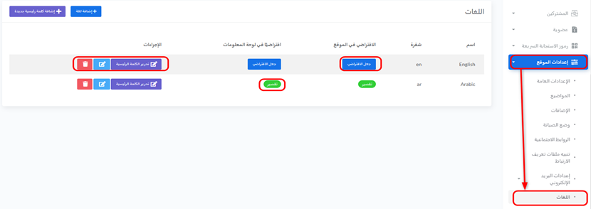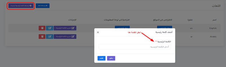 يتيح لك هذا القسم إدارة اللغات المتوفرة على موقعك، وتحديد اللغة الافتراضية للموقع ولوحة التحكم، بالإضافة إلى تخصيص الكلمات المفتاحية لكل لغة.