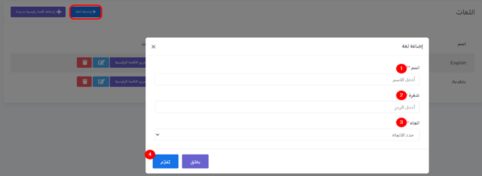 - كيفية الإضافة: انقر على زر “+ اضافه لغه” الموجود في الزاوية العلوية اليمنى من قسم اللغات. (سيفتح عادةً نموذج لإدخال اسم اللغة ورمزها وربما خيارات أخرى).