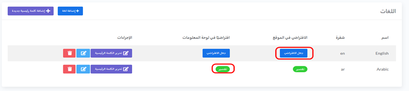 - افتراضي في الموقع : يوضح ما إذا كانت هذه اللغة هي اللغة الافتراضية للموقع التي يراها الزوار.