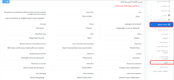 - الوصف: لتعديل ترجمات الكلمات المفتاحية الخاصة بلغة معينة. هذا يسمح لك بتخصيص النصوص المعروضة في واجهة الموقع ولوحة التحكم.