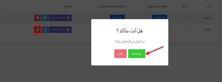 - ملاحظة: لا يمكن حذف اللغة الافتراضية.