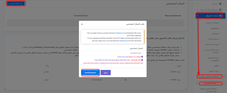 - بعد تعديل سجلات DNS الخاصة بنطاقك وتوجيهها بشكل صحيح إلى المنصة، انقر على زر “Request Custom Domain” في الزاوية العلوية اليمنى.