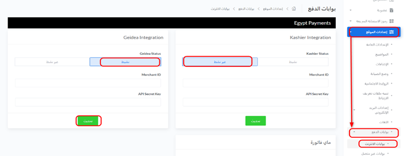الوصول إلى بوابات الدفع: من قائمة ” إعدادات الموقع “، اختر “بوابات الدفع “. ستظهر لك خيارات فرعية: “بوابات الدفع عبر الإنترنت “