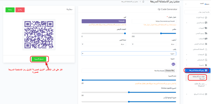 • تنزيل الصورة: انقر على زر ” تحميل الصورة ” الأخضر لتنزيل رمز QR كصورة.