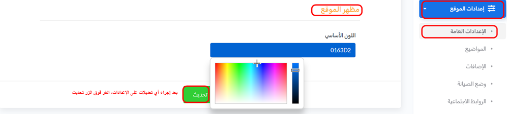 - كيفية التغيير: انقر على مربع اللون لفتح منتقي الألوان واختيار اللون المطلوب. سيتم تحديث رمز اللون (مثال: 0163D2).