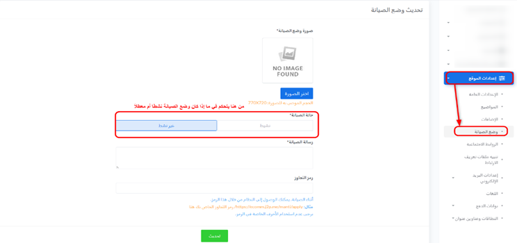 حفظ التغييرات: بعد إجراء أي تعديلات على إعدادات وضع الصيانة، انقر على زر ” تحديث “ الموجود في أسفل الصفحة لحفظ التغييرات وتطبيقها.
