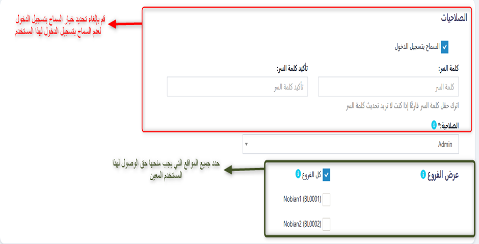 عند إضافة المستخدم، حدد المواقع  (الفروع أو الأقسام) التي يمكنه الوصول إليها. يمكنك تحديد جميع المواقع أو موقع واحد أو أكثر.