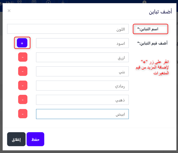 - يمكن إضافة المتغيرات من قائمة المنتجات -> المتغيرات .