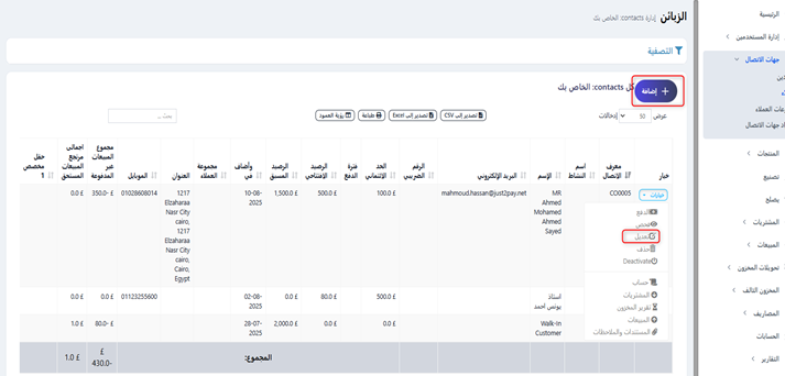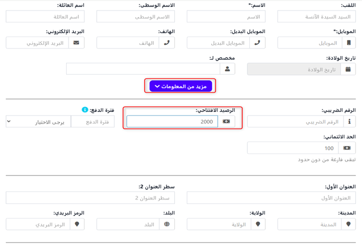 لإضافة رصيد افتتاحي، انتقل إلى جهات الاتصال ← العملاء / الموردين. اختر زر الإضافة أو أضغط على “تعديل” لجهة اتصال موجوده مسبقا. ستجد هناك زر “مزيد من المعلومات”، انقر عليه وأضف مبلغ الرصيد الافتتاحي المطلوب إضافته لذلك المستخدم.