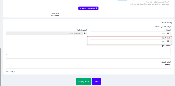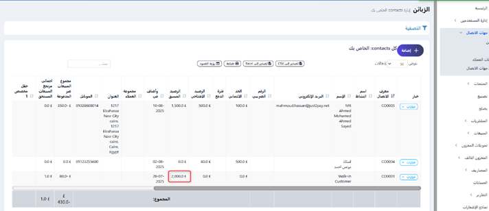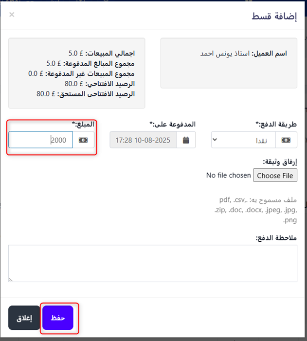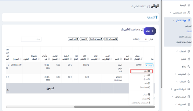 اذهب إلى جهات الاتصال → العملاء / الموردين  اضغط على زر الإجراءات ستجد خيار الدفع، انقر عليه. ستظهر نافذة منبثقة لإضافة دفعة، وأضف قيمة المبلغ المطلوب، ثم أضغط على زر “حفظ”.