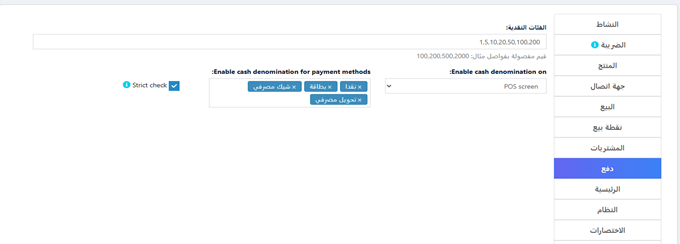 يمكن إضافة فئات نقدية عند إجراء عملية بيع أو شراء. لتفعيل هذه الميزة، انتقل إلى الإعدادات ← إعدادت الشركة ← الدفع.