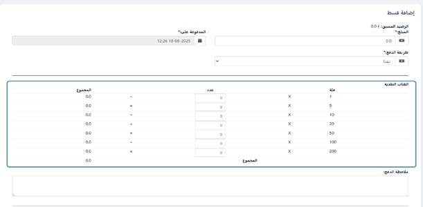 عند إغلاق الكاشير للخزنة ، سيُطلب منه إدخال عدد كل فئة نقدية. عند إدخال هذا العدد، سيتم حساب المبلغ الإجمالي تلقائيًا.