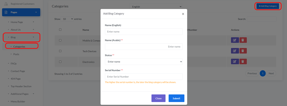 Access: To access the “+Add Blog Category” interface, navigate to “Pages” -> “Blog” -> “Category” -> “+Add Blog Category” in your dashboard.