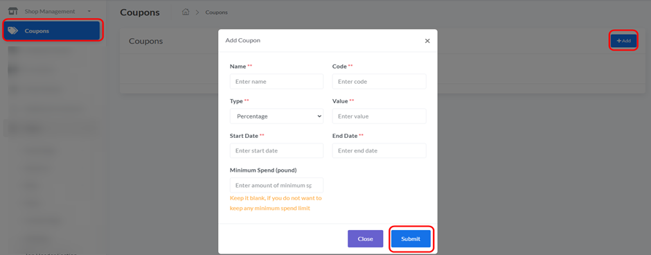 When you click “+ Add,” an “Add Coupon” pop-up window will appear, requiring you to fill in the following details: