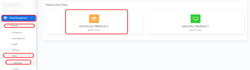 Access: From “Shop Management” > “Items” >”+ Add Item” and selecting “PHYSICAL PRODUCT” from the “Choose Item Type” screen.