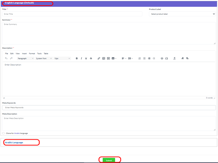 - Description: If multiple languages are enabled, you can click “Clone for Arabic language” to copy content from the English section or manually enter translations for the title, summary, description, meta keywords, and meta description in Arabic.