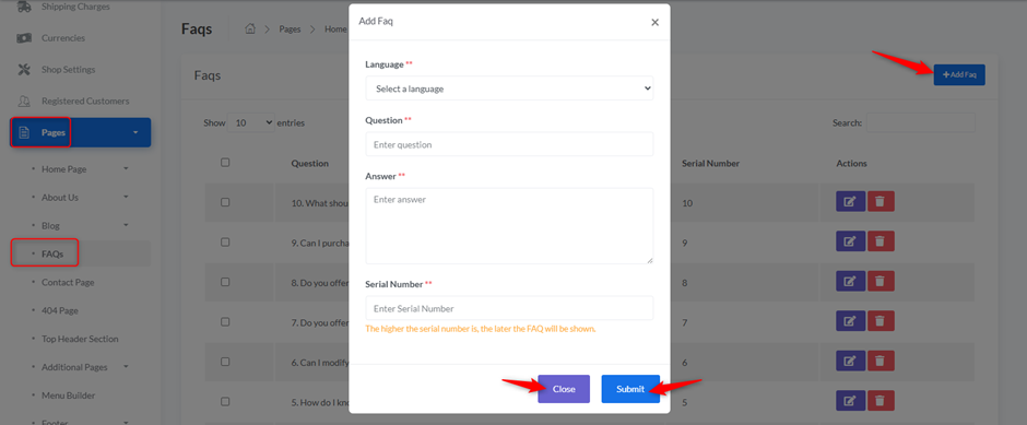 - Enter a serial number to determine the display order of the FAQ. The higher the serial number, the later the FAQ will be shown.