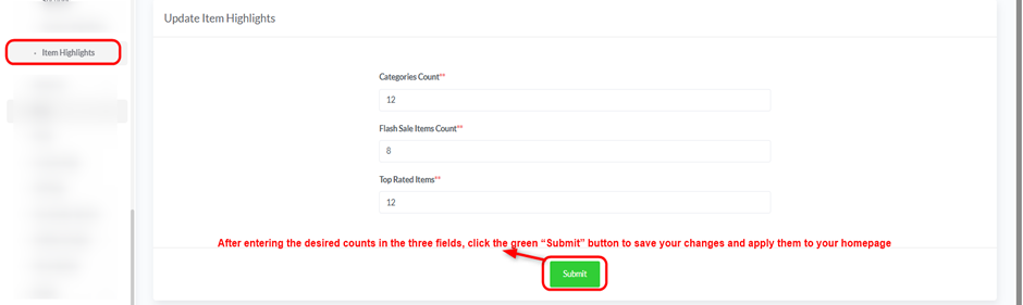 Overview: This section allows you to set the numerical counts or limits for specific highlight elements displayed on your homepage, such as the number of categories, flash sale items, or top-rated products. This provides precise control over the quantity of content presented in these key sections.