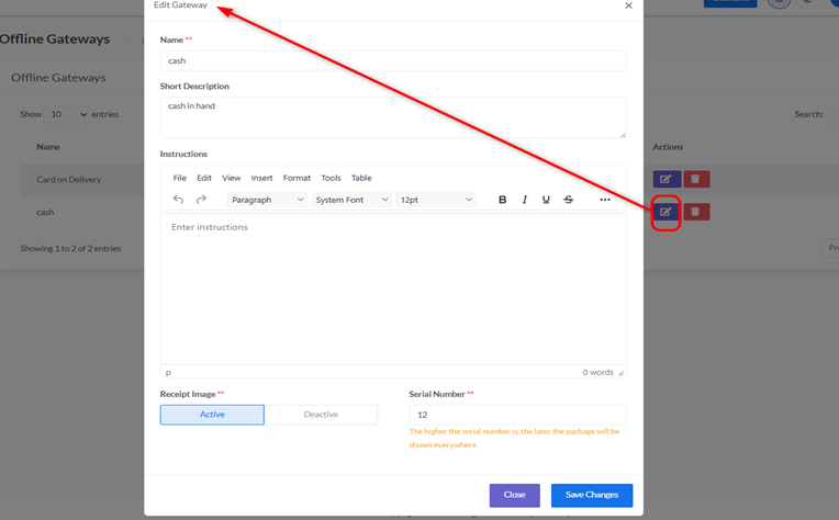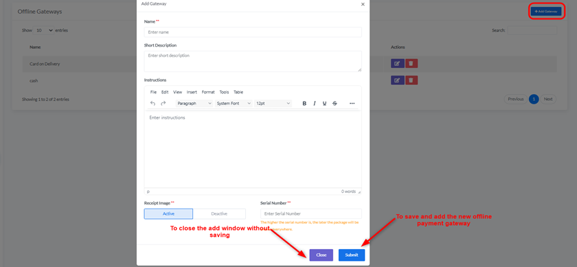 • Serial Number: To determine the display order of this payment method among other payment gateways. The higher the number, the later the method will appear.