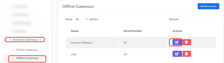 Managing Existing Offline Gateways: In the “Offline Gateways” list, you will find the payment methods you have added: