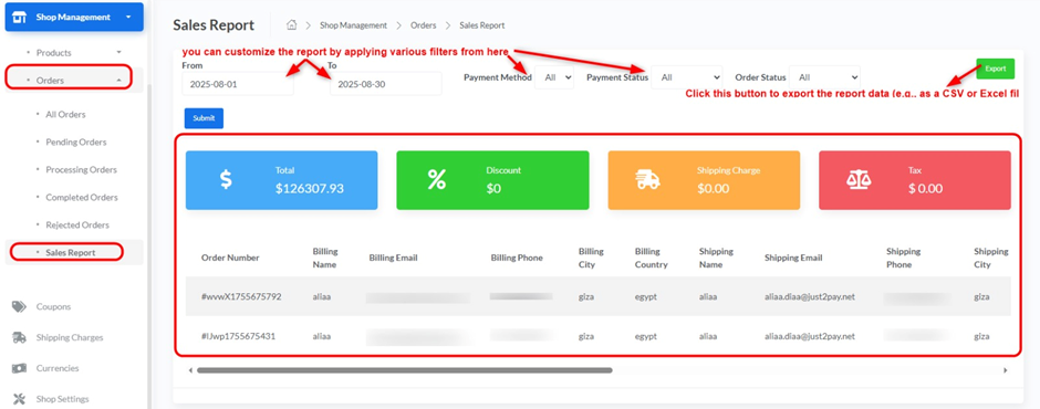 Access: From “Shop Management” > “Orders,” select “Sales Report”.