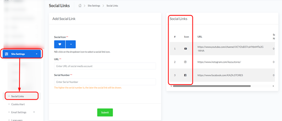 • After filling in all fields, click the “Submit” button to add the new social link.