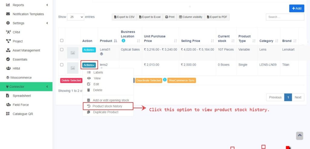 - The Product Stock History feature allows you to view detailed records of all stock-related transactions for a specific product, including: