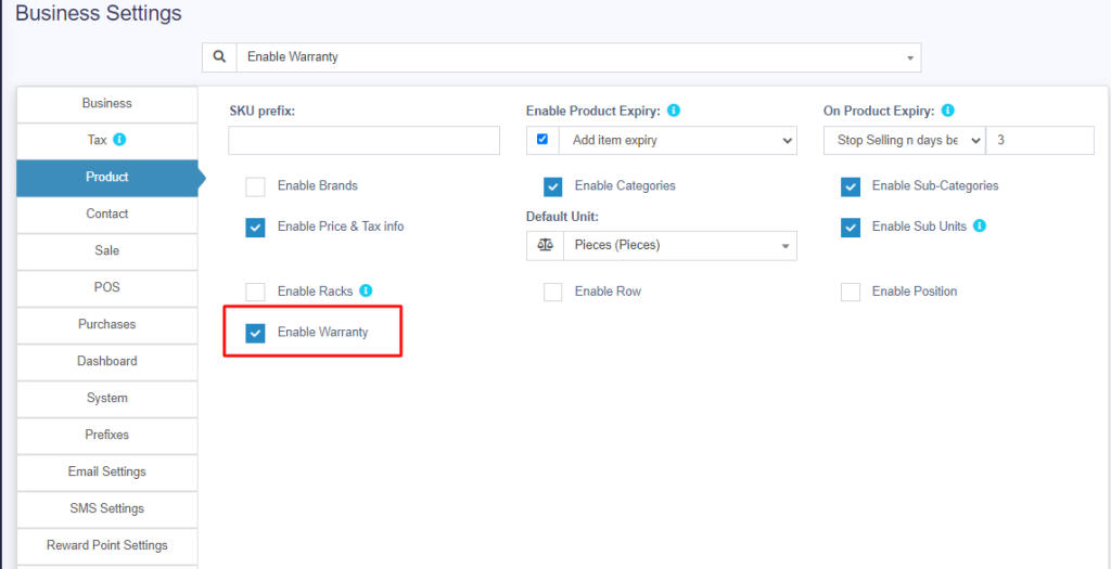 To enable warrany in products go to Settings -> Business Settings -> Products -> Enable Warranty