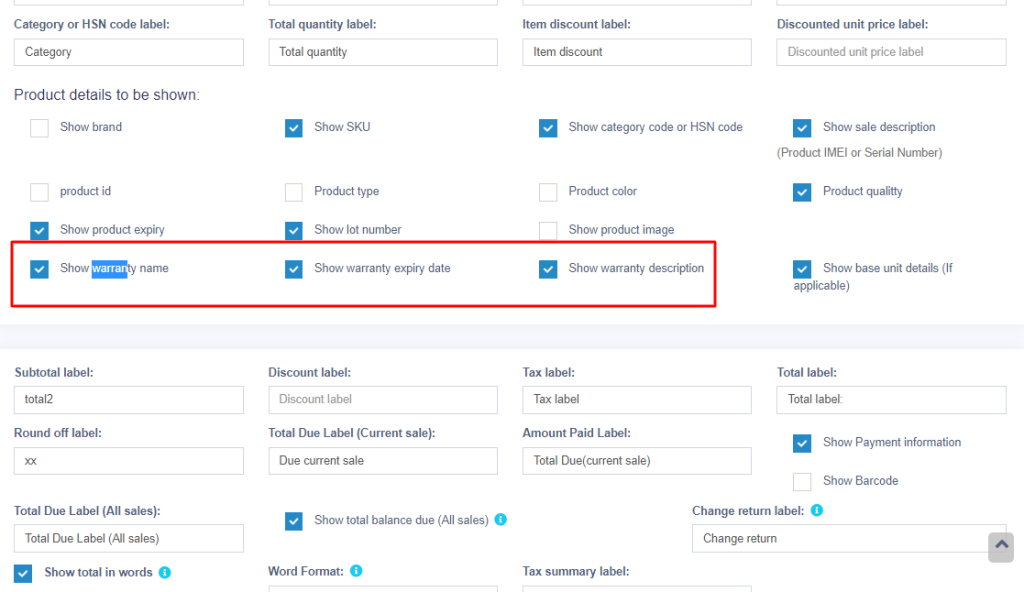 3. Sell with warranty: Any products which has warranty assigned when sold will use the transaction date as start of warranty. You can display warranty in receipts by enabling it from Invoice layout.