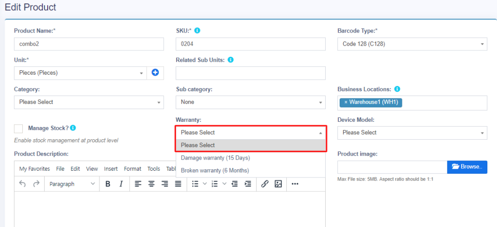 2. Assigining warranty for products: Go to Add/Edit product and select the warranty that is applicable for the product.