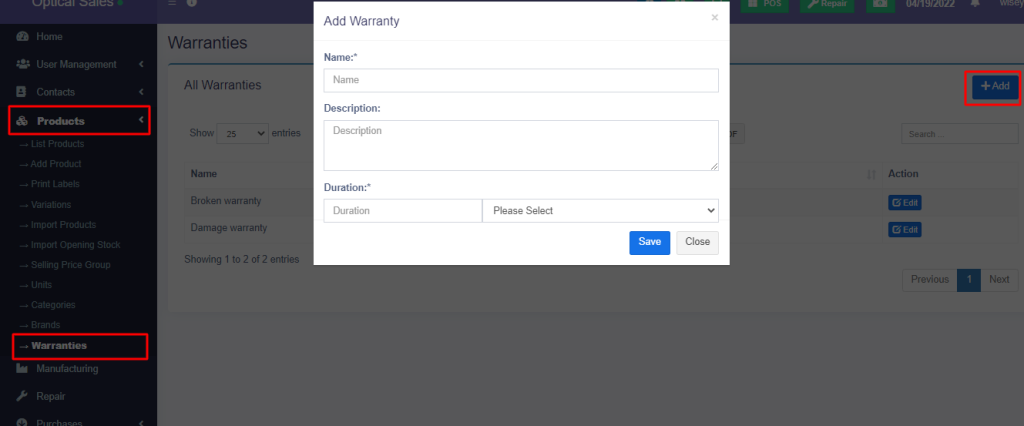 1. Adding Warranty: Add warranty types by going to Products -> Warranty.