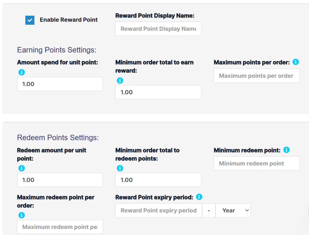 - Redeem point expiry period: Expiry period for points earned by customers. You can set it in months or years. Expired points will get deducted from the customer account automatically after this period.