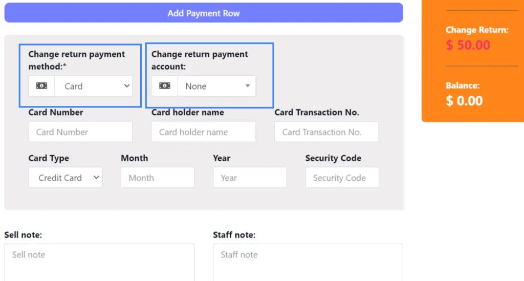 To add the payment method/payment account for change return, you can select the payment method/payment account in the Change return payment method and  payment account dropboxs in the POS screen.